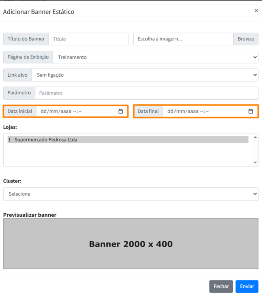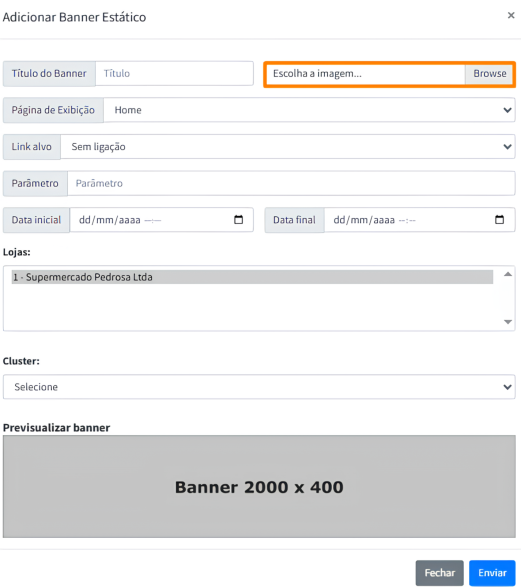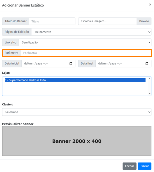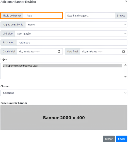 O campo "Cluster" permite segmentar o público-alvo da campanha. Com ele, você direciona o banner para grupos específicos de clientes conforme critérios previamente definidos, como localização, perfil de consumo ou frequência de compras.