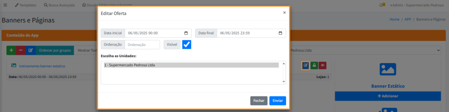 Essa tela aparece ao editar uma oferta já cadastrada, permitindo ajustar informações como a data de exibição, a ordenação (caso deseje mudar a posição do banner na lista) e a visibilidade, que define se o banner estará ou não ativo para os usuários. Também é possível alterar as unidades (lojas) nas quais o banner será exibido. Após as edições, basta clicar em "Enviar" para salvar as alterações.