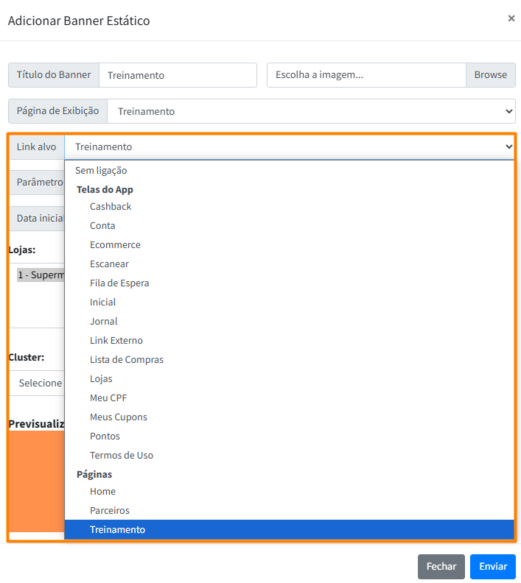 O campo "Link alvo" define o destino ao qual o usuário será direcionado ao clicar no banner. Você pode escolher: