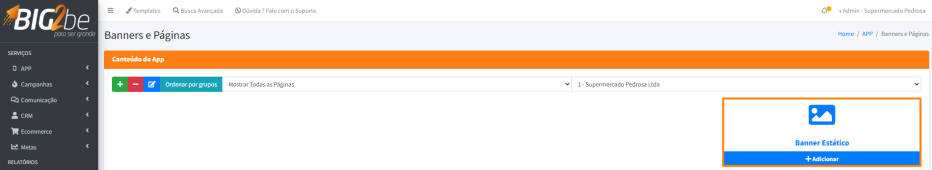 Essa função permite adicionar um novo banner estático à página selecionada no aplicativo. Ao clicar em “+ Adicionar”, você será direcionado para a tela de configuração.