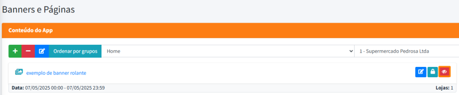 Essa é a visualização do banner rolante já cadastrado. Para remover esse conteúdo do aplicativo, basta clicar no ícone vermelho com o olho cortado (ocultar/desativar) ou, se preferir, no ícone da lixeira (caso apareça) para excluir definitivamente o banner do sistema.