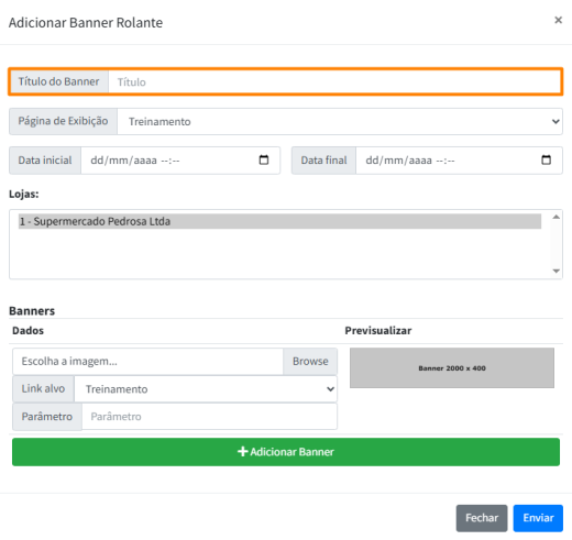 Essa função permite adicionar um novo banner rolante à página selecionada no aplicativo. Ao clicar em “+ Adicionar”, você será direcionado para a tela de configuração.