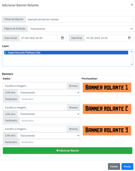 Esse botão serve para adicionar o banner selecionado ao conjunto rolante. Após preencher as informações e escolher a imagem, você clica em “Adicionar Banner” para que ela entre na lista de banners que irão aparecer no carrossel do aplicativo. Você pode repetir esse processo para incluir quantas imagens quiser dentro do mesmo grupo.