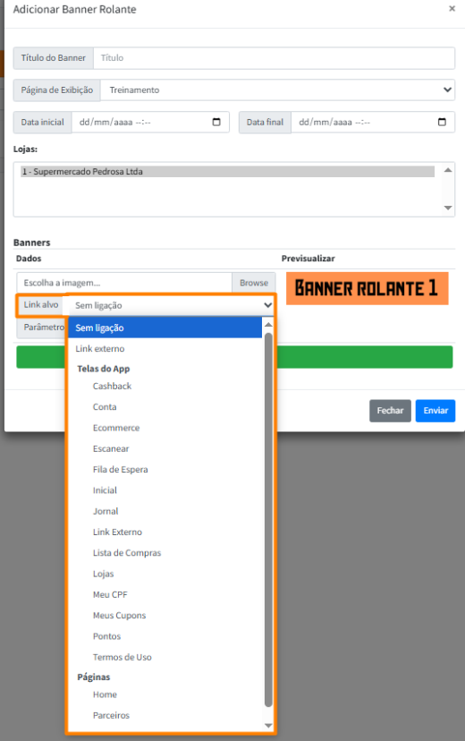 O campo "Link alvo" permite definir para onde o usuário será direcionado ao clicar no banner rolante. Você pode escolher:
