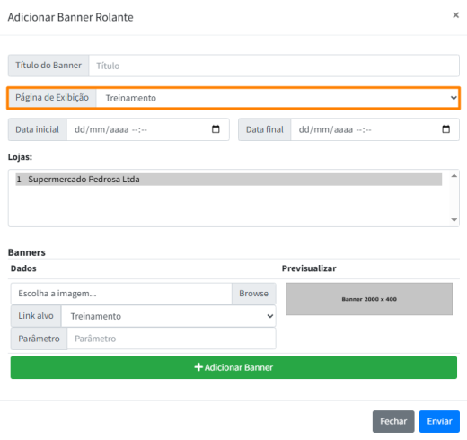 Esse campo define a página do aplicativo onde o banner será exibido. Ao selecionar uma das páginas disponíveis, como "Treinamento", você está determinando em qual área do app o banner aparecerá para os usuários. Isso permite direcionar o conteúdo visual para o local mais relevante dentro do aplicativo.