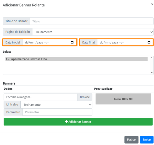 Os campos "Data inicial" e "Data final" definem o período em que o banner será exibido no aplicativo. A data inicial marca quando o banner começará a aparecer para os usuários, enquanto a data final determina quando ele deixará de ser exibido. Essa configuração é ideal para controlar automaticamente o tempo de exibição de campanhas e promoções, garantindo que o conteúdo entre e saia do ar nas datas certas.