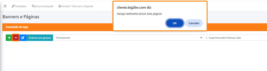 Essa função serve para excluir uma página do aplicativo. Ao clicar no ícone vermelho, o sistema exibe uma mensagem de confirmação perguntando se você realmente deseja apagar a página selecionada. A exclusão só será concluída após a confirmação clicando em "OK".