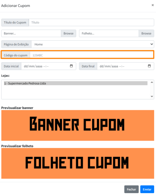O Código do Cupom é o código que os usuários devem inserir para ativar a promoção ou obter o desconto oferecido pelo cupom.