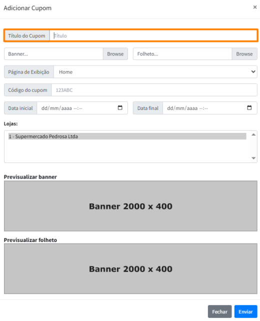 O campo "Título do Cupom" permite definir um título para o cupom. Esse título será exibido para o usuário e ajudará a identificar a promoção ou oferta associada ao cupom de forma clara e direta.