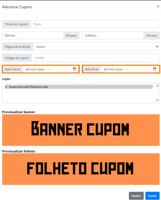 A Data inicial marca o início da validade do cupom, enquanto a Data final indica quando o cupom deixará de ser válido. Durante esse intervalo, o cupom poderá ser utilizado pelos clientes.