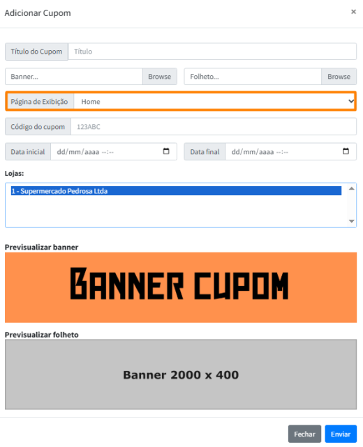 A Página de Exibição define onde o cupom será mostrado no aplicativo. Ao escolher a página (por exemplo, "Home"), o cupom será exibido nessa área específica da interface do aplicativo.