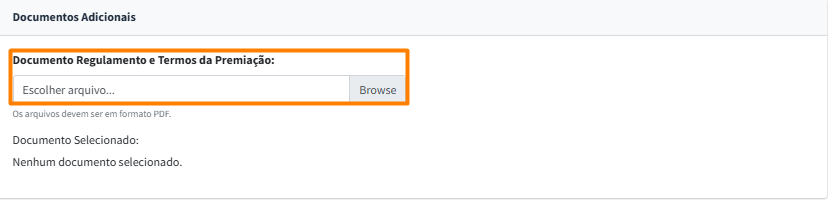 O campo "Documento Regulamento e Termos da Premiação" permite o upload de um arquivo PDF que contenha as regras completas e os termos da premiação. Este documento serve para esclarecer todos os detalhes legais e as condições da campanha, como requisitos de participação, prêmios, responsabilidades e validade.