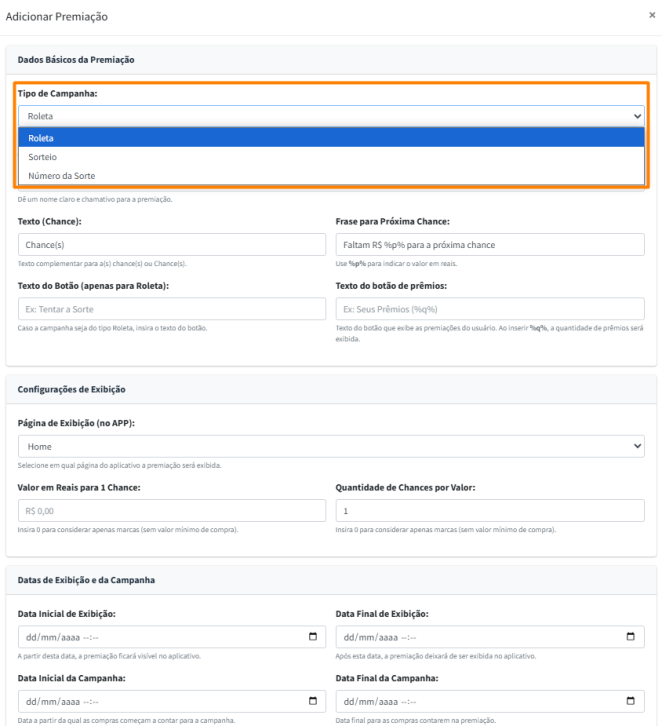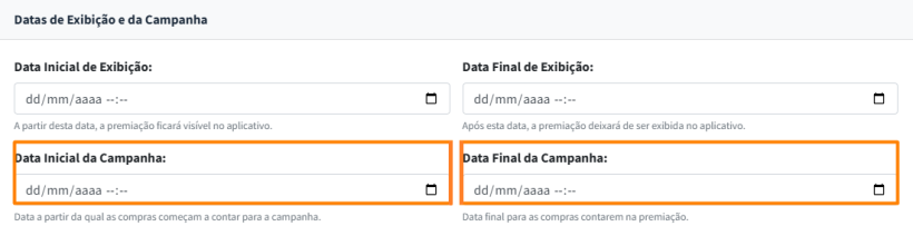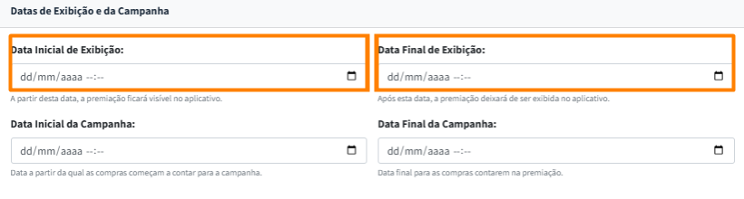 Os campos "Data Inicial de Exibição" e "Data Final de Exibição" controlam o período em que a premiação ou campanha será visível no aplicativo para os usuários.