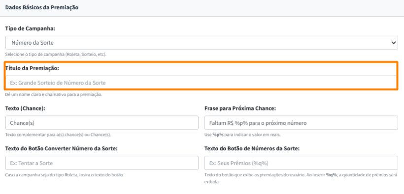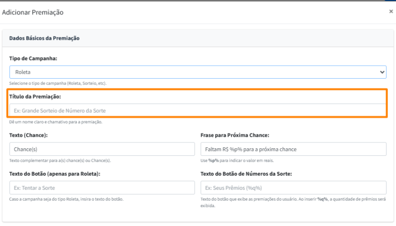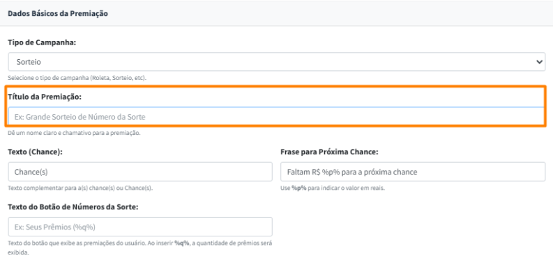 O campo "Título da Premiação" permite que você defina um nome claro e chamativo para a sua premiação. Esse título será exibido aos usuários, facilitando a compreensão sobre o que estão ganhando ao participar da campanha. No exemplo mostrado, o título é "Grande Sorteio de Número da Sorte".
