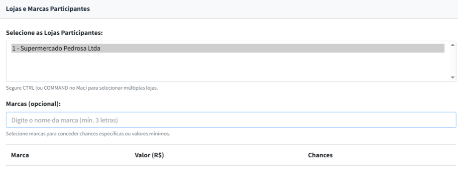 Marcas (opcional): Neste campo, você pode adicionar marcas específicas que irão participar da campanha. O objetivo aqui é permitir que marcas selecionadas tenham regras diferentes para a concessão de chances ou valores. Ao adicionar uma marca, você poderá configurar um valor mínimo de compra para que as chances para o sorteio ou premiação sejam contabilizadas.