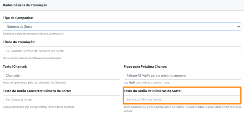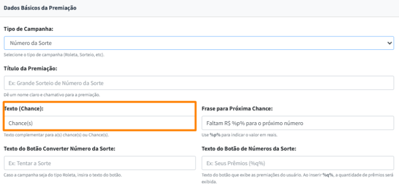 O campo "Texto (Chance)" permite que você defina um texto personalizado para a palavra "Chance(s)" que será exibida na campanha de premiação. Esse texto pode ser algo como "Chance(s)" ou qualquer outra palavra que seja mais apropriada para a promoção.