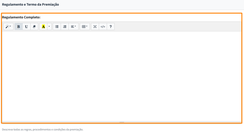 Esse campo "Regulamento Completo" é onde você pode adicionar o texto que descreve todas as regras, procedimentos e condições da premiação.