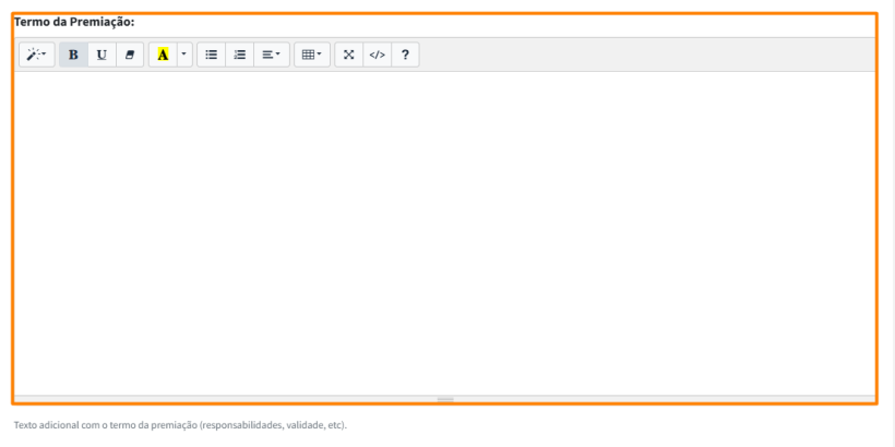 O campo "Termo da Premiação" é onde você pode inserir um texto adicional que descreve as responsabilidades, validade e outros detalhes legais relacionados à premiação.