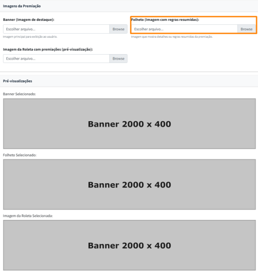 O Folheto (Imagem com regras resumidas) é um campo utilizado para exibir detalhes ou regras resumidas da premiação. Ele funciona como uma imagem complementar, oferecendo informações rápidas ou um resumo das condições da campanha, como um guia visual para os participantes, facilitando o entendimento das regras de forma objetiva.
