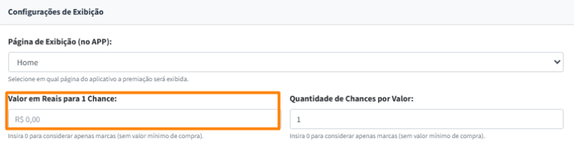 O campo "Quantidade de Chances por Valor" define o número de chances que o usuário ganha para cada valor inserido no campo anterior "Valor em Reais para 1 Chance".