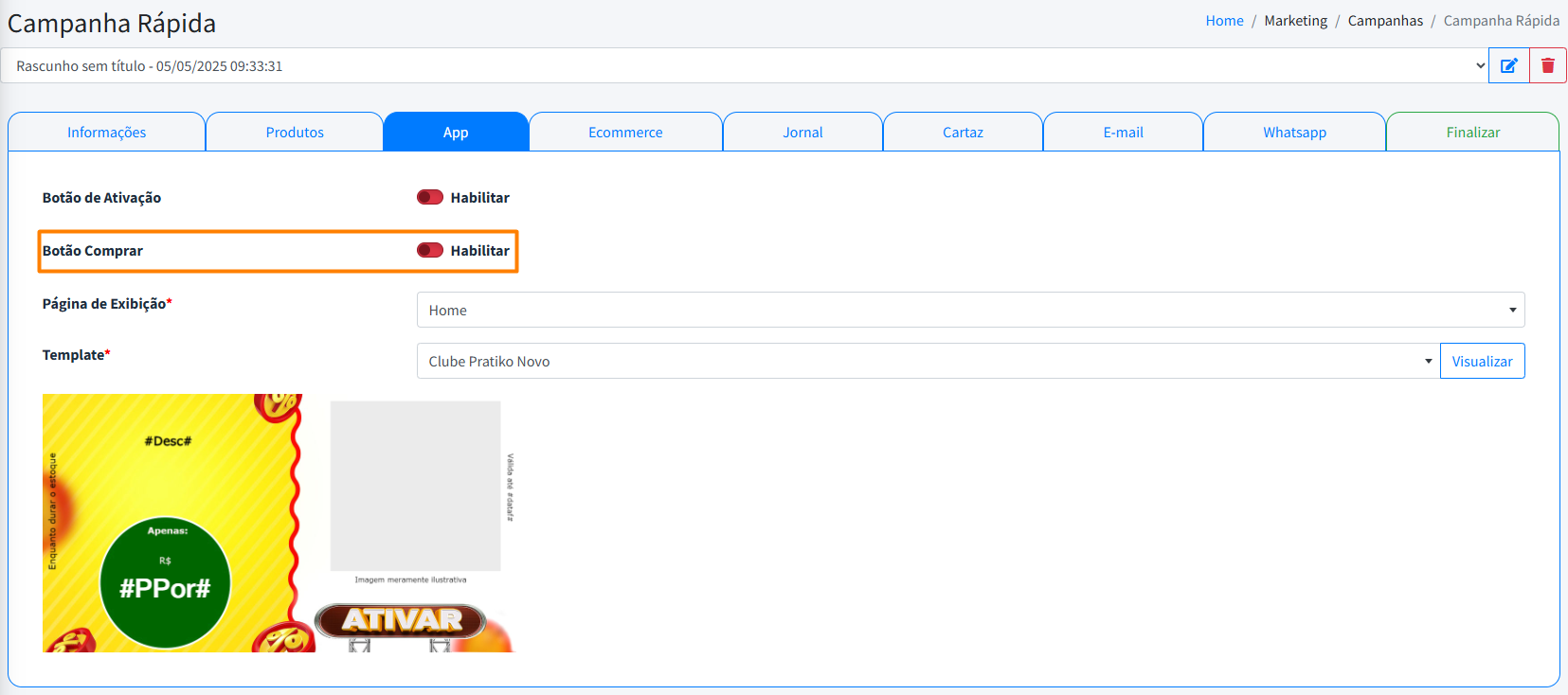 Essa funcionalidade destacada na aba App, com a opção “Habilitar” ativada. Essa configuração é útil para campanhas com foco em agilidade e conveniência na jornada do consumidor.