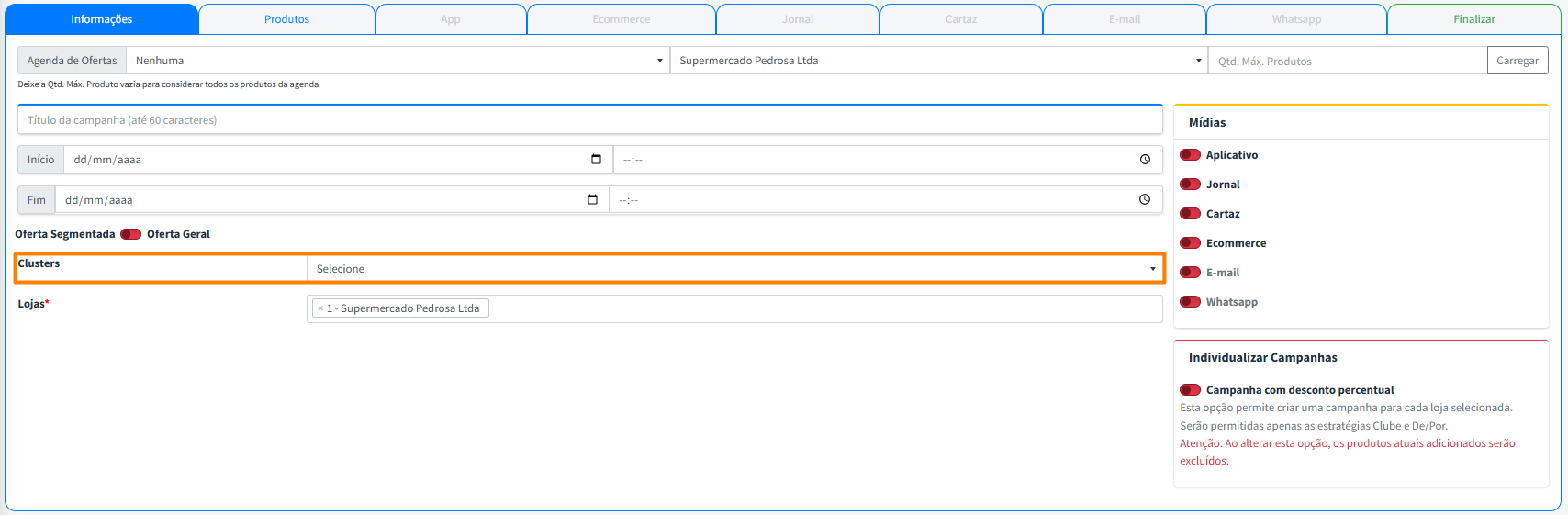 Essa imagem representa o preenchimento da tela de configuração da campanha, com foco na definição de clusters, ferramenta estratégica para personalizar o alcance da ação.