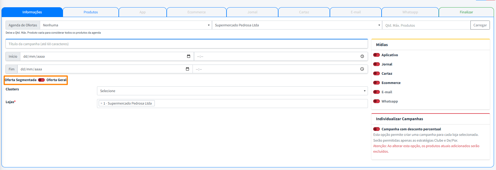 Essa tela representa o início da configuração de uma campanha promocional, com destaque para a definição do tipo de oferta