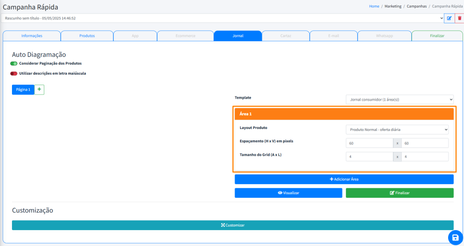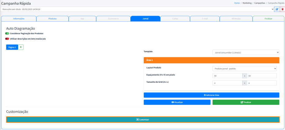 A área de Customização permite montar o jornal diretamente pelo nosso portal, ajustando layout, espaçamento e organização de forma visual, como em um canvas. Ideal para quem busca personalizar a apresentação das ofertas com mais liberdade.
