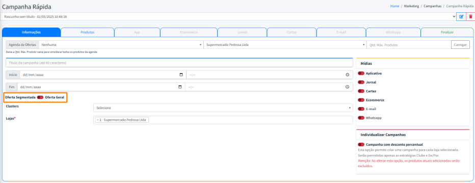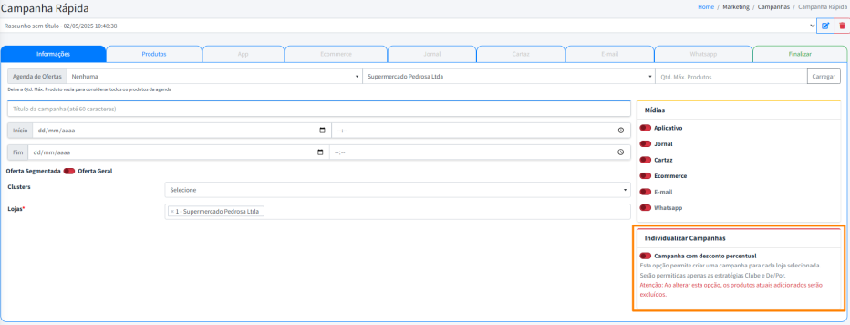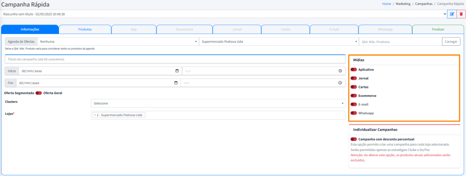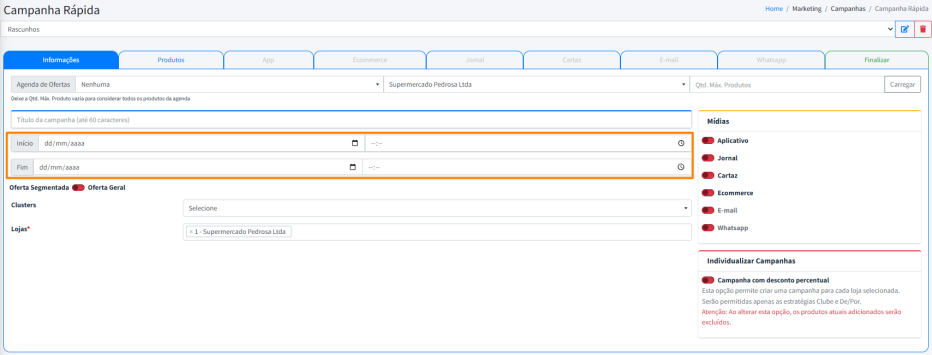 As Mídias definem como e onde as promoções serão apresentadas ao público. Isso inclui canais como o aplicativo, jornal, cartaz, e-mail, ecommerce e WhatsApp.