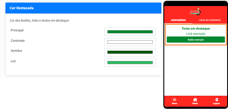 - Cor Rodapé: Refere-se à cor do fundo e borda do rodapé do app, que é a parte inferior da tela. Aqui, você pode personalizar as cores para complementar a estética do app e tornar os ícones ou links visíveis.