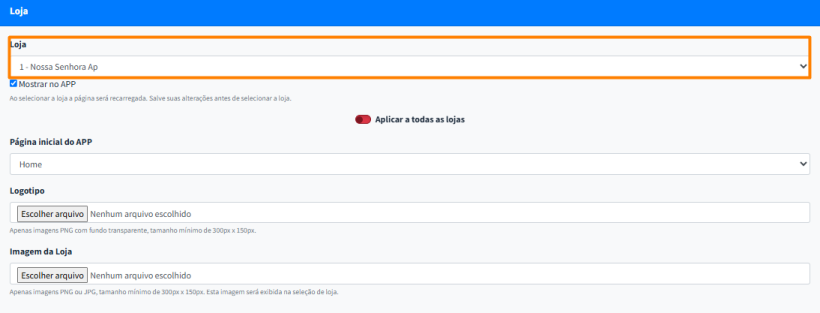 O campo Imagem da Loja permite que você selecione uma imagem específica para representar a loja no aplicativo. Essa imagem aparecerá na seção de seleção da loja, onde os usuários poderão visualizar as opções disponíveis.