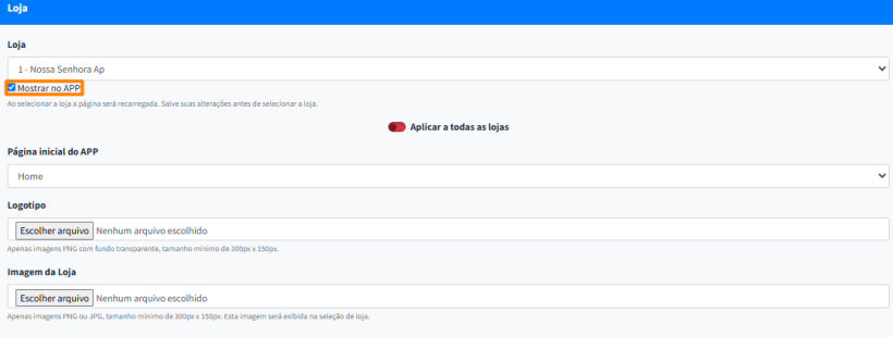 O campo "Aplicar a todas as lojas" permite aplicar as mesmas configurações feitas para a loja selecionada a todas as lojas registradas no sistema. Se essa opção estiver ativada, todas as lojas serão configuradas de forma uniforme.