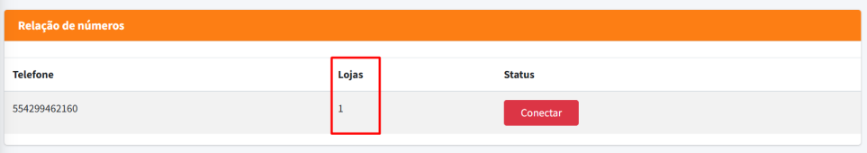 O campo Lojas indica a quantidade de unidades ou filiais que estão associadas a este número de WhatsApp dentro do sistema.